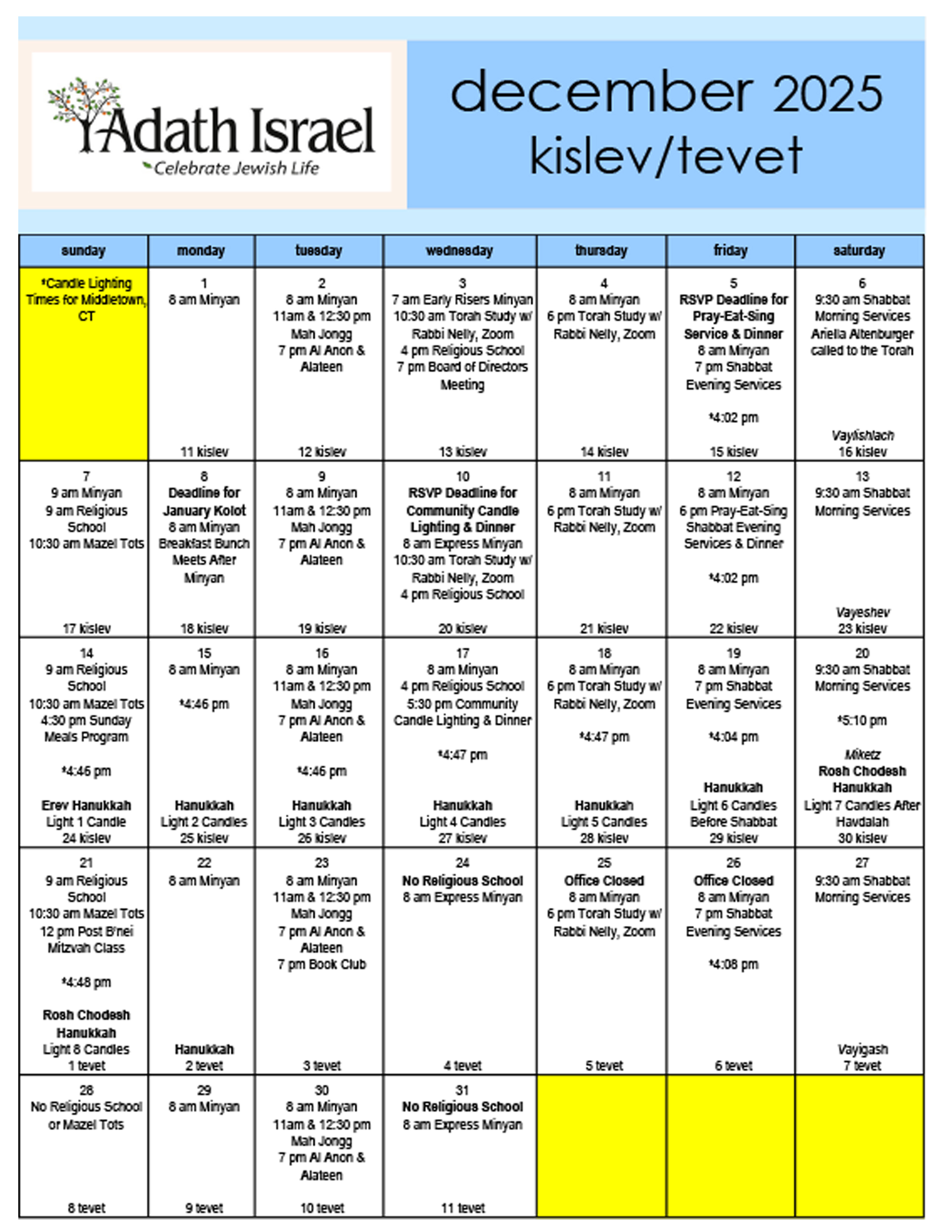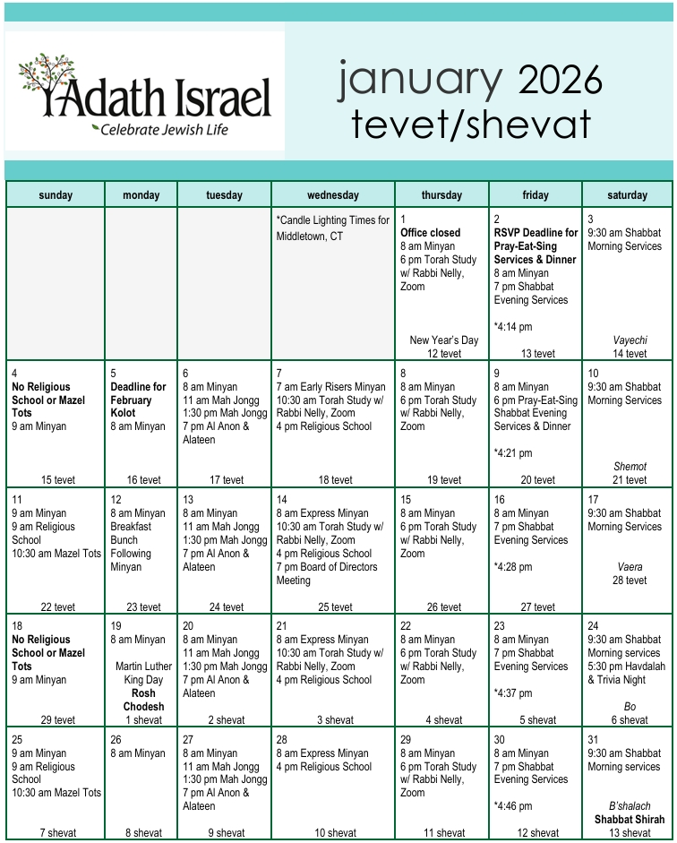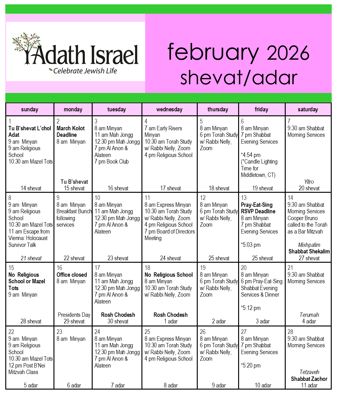 Events Service Times Minyan Daily morning minyan (Mon.-Fri.) 8:00 a.m. Sunday 9:00 a.m. Early Risers Minyan (1st Wednesday of the month) 7:00 a.m. Friday Evening Service 7:00 p.m. Pray-Eat-Sing (once a month) 6:00 p.m. Saturday Morning Service 9:30 a.m.