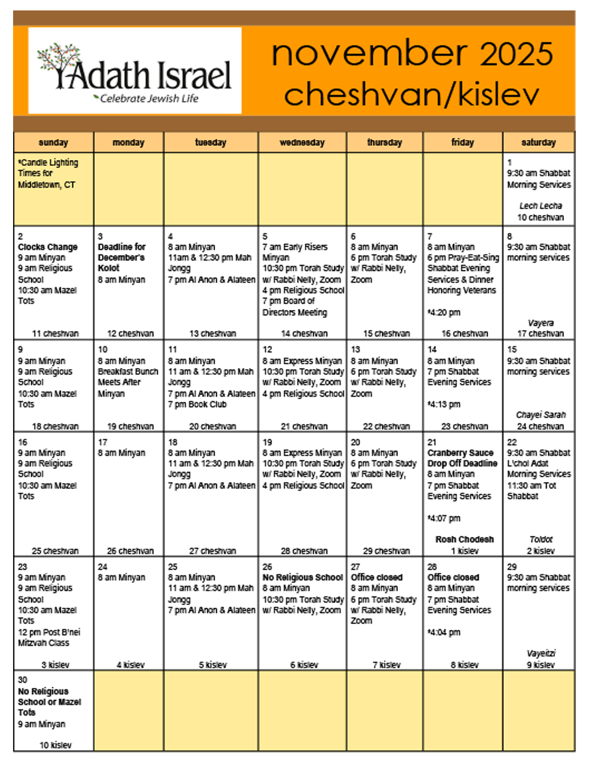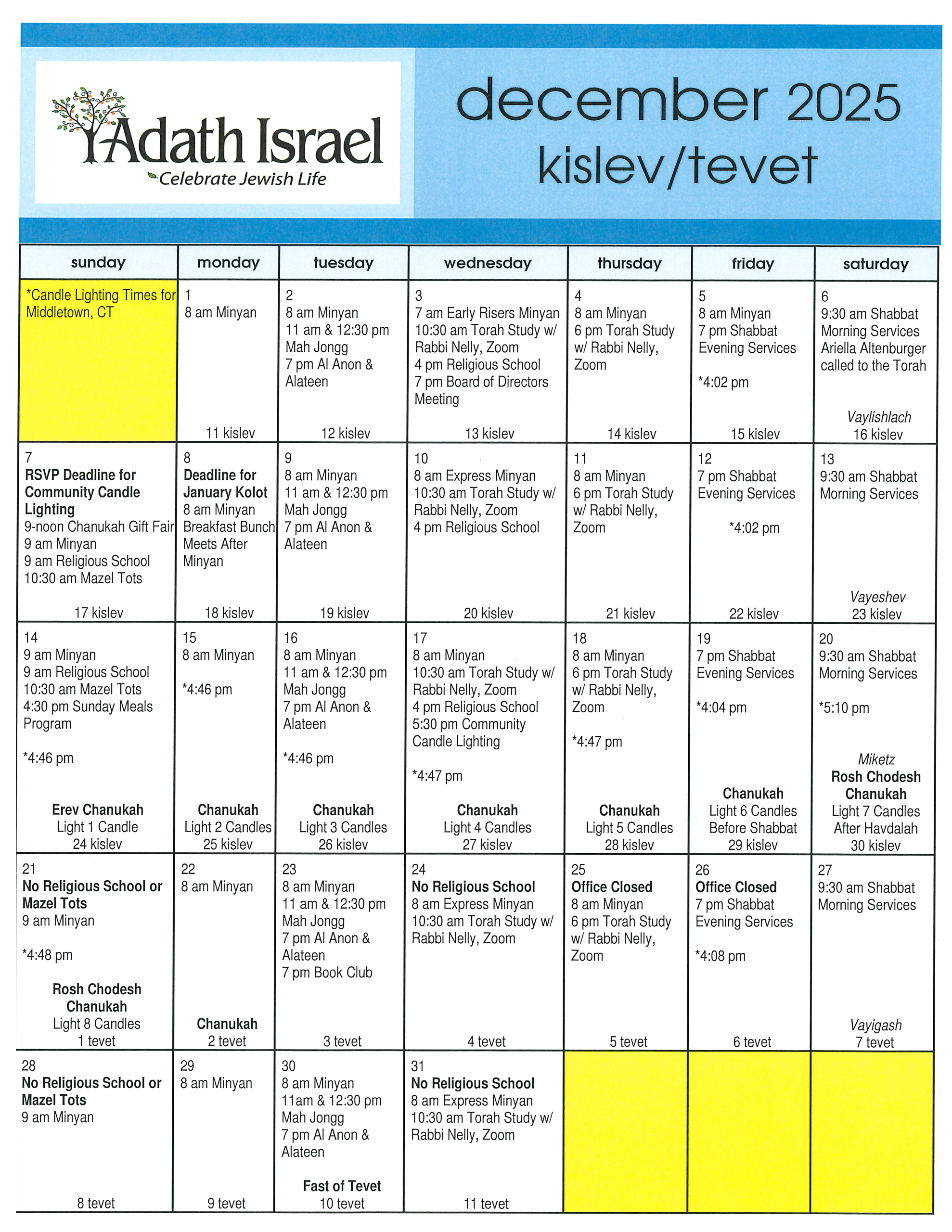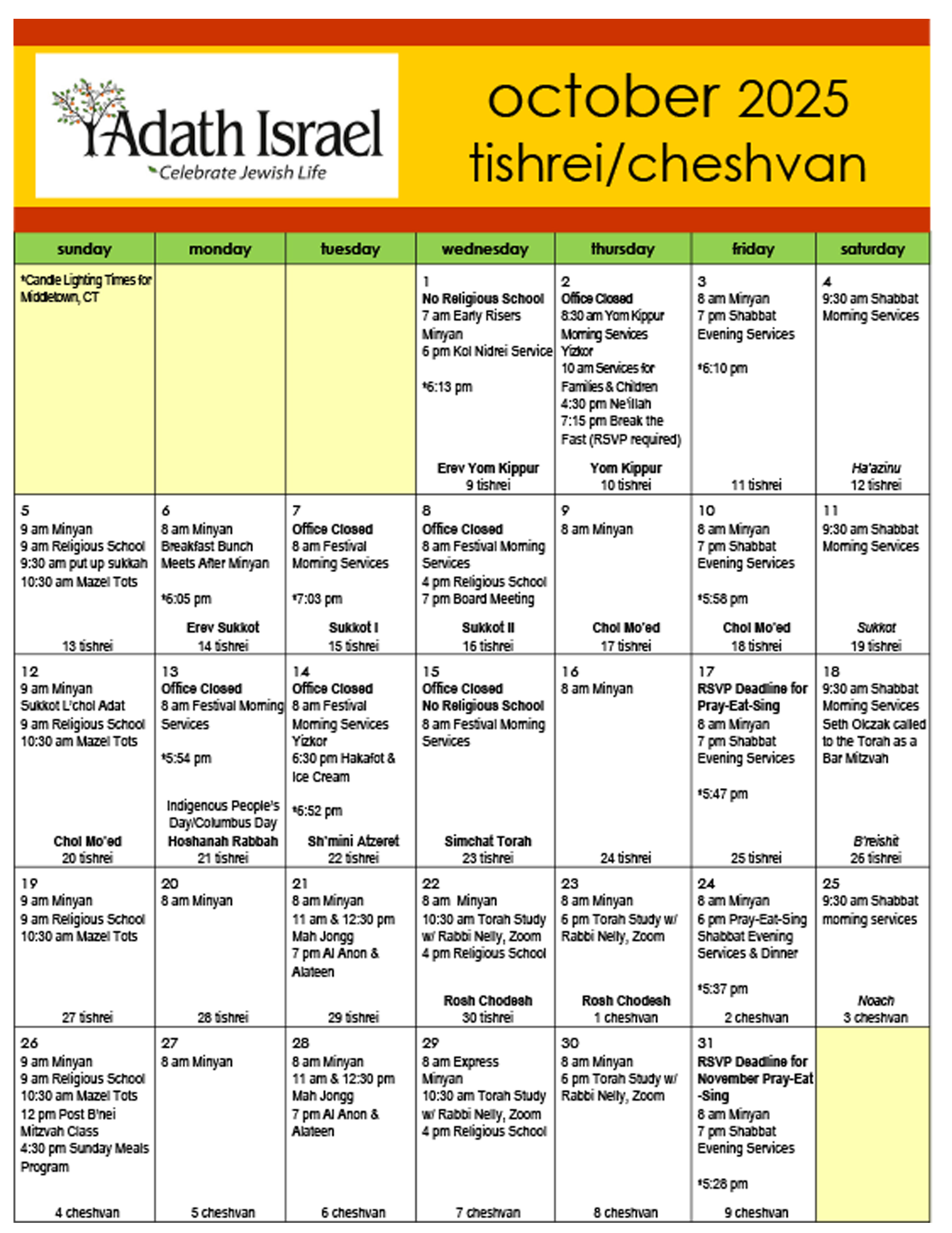 Events Service Times Minyan Daily morning minyan (Mon.-Fri.) 8:00 a.m. Sunday 9:00 a.m. Early Risers Minyan (1st Wednesday of the month) 7:00 a.m. Friday Evening Service 7:00 p.m. Pray-Eat-Sing (once a month) 6:00 p.m. Saturday Morning Service 9:30 a.m.
